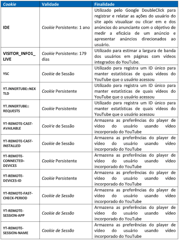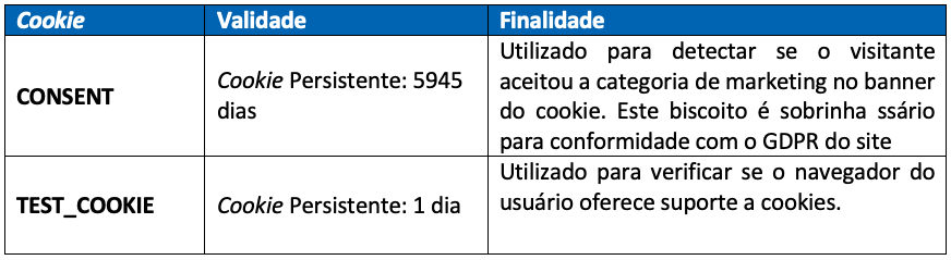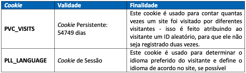 Apresentamos abaixo os detalhes sobre o uso dos Cookies no site, bem como as suas finalidades: